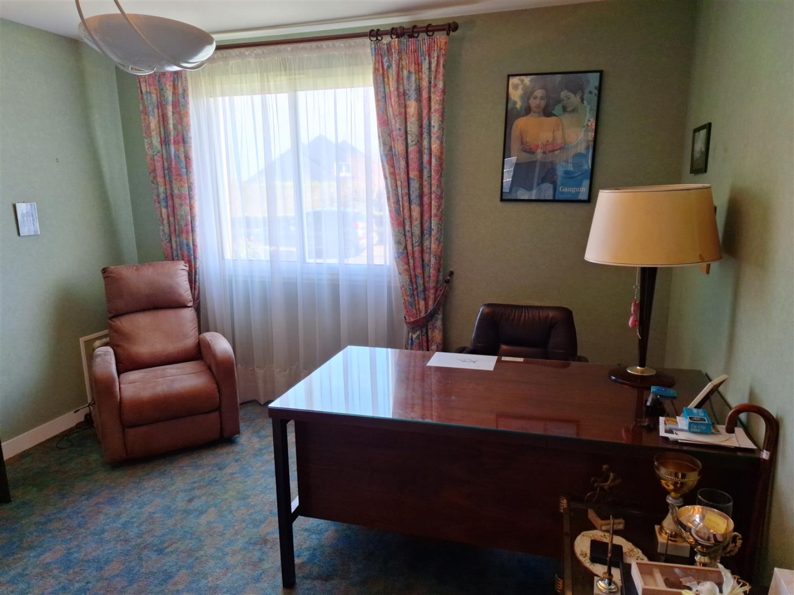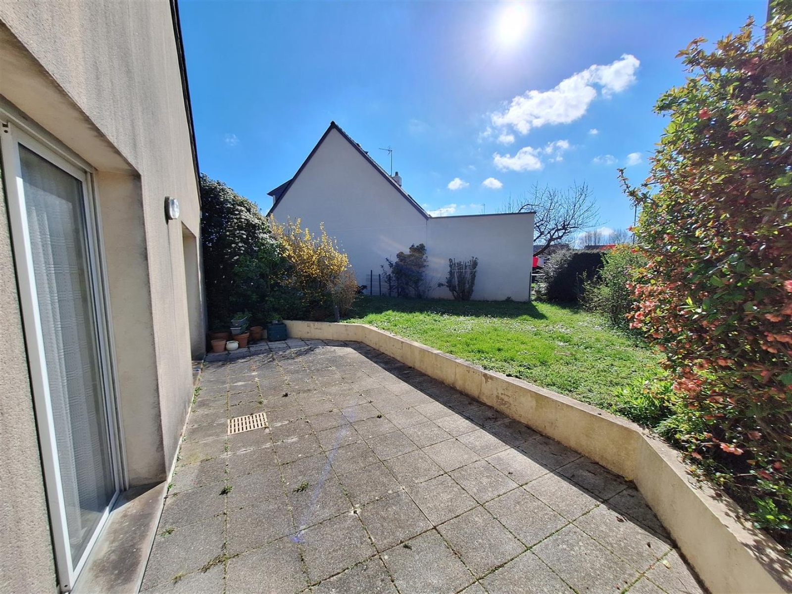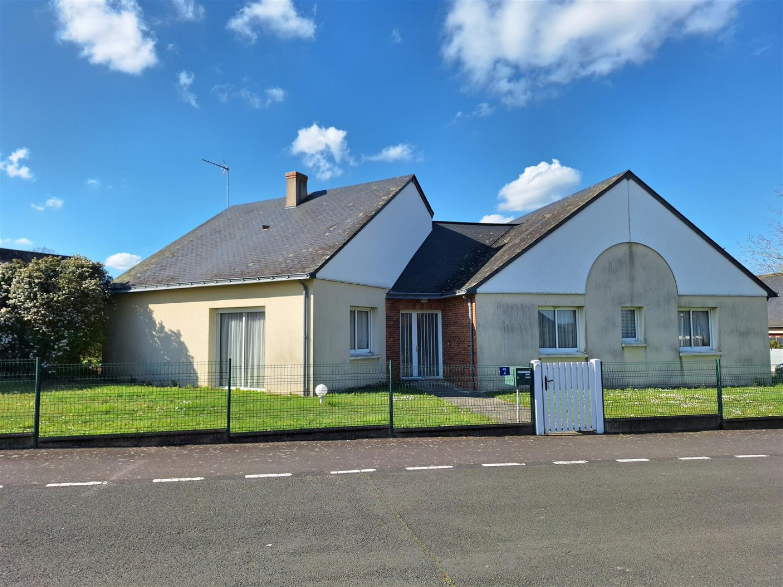 Le terrain verdoyant et arboré de 919 m² est entièrement clos et comprend une terrasse, une cour goudronnée, ainsi qu’un jardin potager.