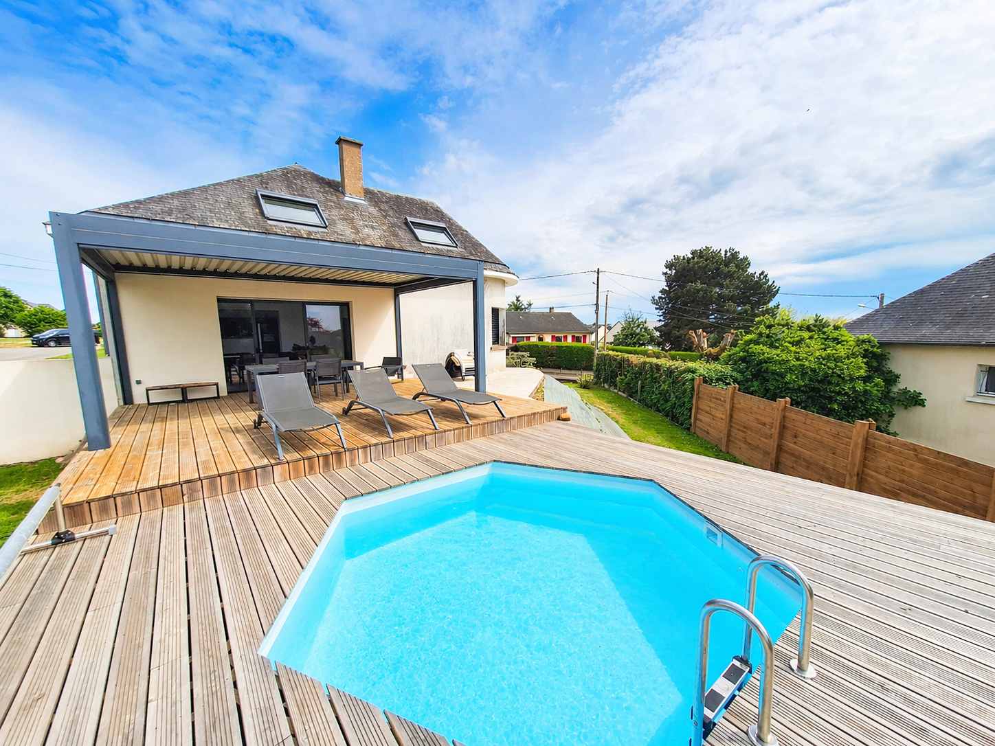 À l’extérieur, vous profiterez d’un magnifique jardin arboré de 1220 m², agrémenté d’une terrasse en bois, d’une pergola bioclimatique et d’une piscine chauffée, idéale pour des moments de détente et de convivialité.